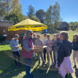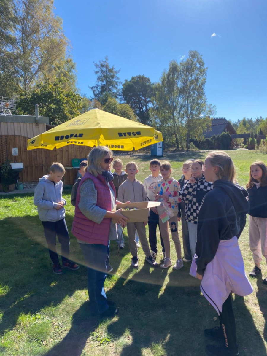 Kolejnym punktem programu były zajęcia inspirowane lekturą "Chłopcy z Placu Broni". Podzieleni na grupy rozpoczęliśmy rywalizację. Najpierw sprawdzaliśmy swoją wiedzę w quizie dotyczącym książki. Następnie z przyniesionych materiałów – szyszek, patyków i kamieni – układaliśmy herby drużyn. Kolejną konkurencją było szukanie ukrytej flagi, a na zakończenie odbyły się rzuty szyszkami do celu.