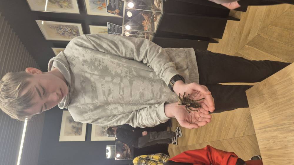 Następnie uczniowie odwiedzili wystawę pająków, gdzie mogli z bliska przyjrzeć się różnym gatunkom tych fascynujących stworzeń a najodważniejsi mieli niepowtarzalną okazję, aby wziąć pająka na ręce. Dzięki ciekawym opowieściom przewodnika zgłębili wiedzę o ich budowie oraz zwyczajach.